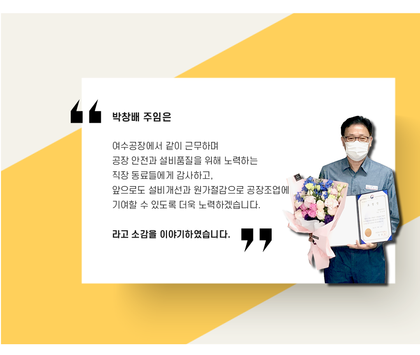 산업통상자원부가 주최하고 대한상공회의소가 주관하는 ‘제48회 상공의 날’ 유공자 포상에서 박창배 주임(여수 설비검사팀)이 산업통상자원부 장관 표창을 수상하였습니다. 박창배 주임은 코로나19로 기념식을 참석하지는 못하였지만 여수공장에서 박창배 주임을 위하여 공무담당임원 주관으로 시상식을 가졌습니다.
