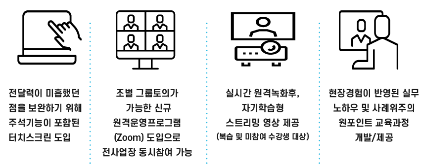 한화솔루셔누기술교육센터는 고품격 원격 기술교육을 통해 코로나 환경에서도 임직원들에게 안전하고 우수한 교육환경을 제공하는데 최선을 다하겠습니다.