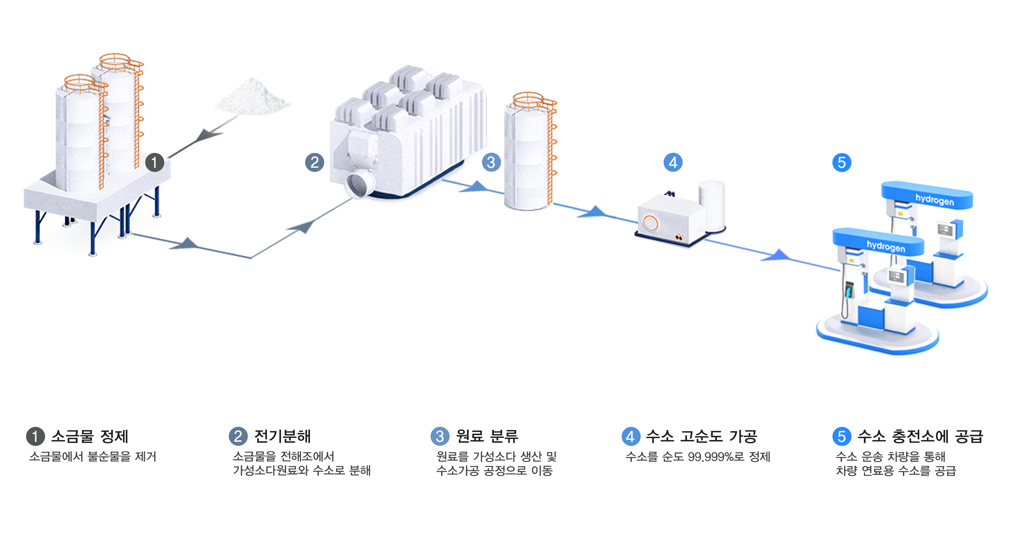 한화솔루션은 가성소다의 원료인 소금(NaCl)을 물(H2O)에 녹여 분해하는 방식으로 수소(H2)를 생산해 오는 7월부터 차량 연료용 수소를 공급할 예정입니다. 소금물로 만든 수소는 정제과정을 거치면 순도 99.999%의 차량 연료용 수소로 전환되어 수소 자동차의 연료로 사용되게 됩니다.