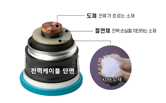 XLPE는 폴리에틸렌(PE)에 첨가제를 넣어 절연·내열 성능을 높인 고부가 제품으로,전력 케이블에 주로 사용되며 전기가 흐르는 금속 도체를 감싸 열을 차단하고, 전력손실을 막아줍니다.