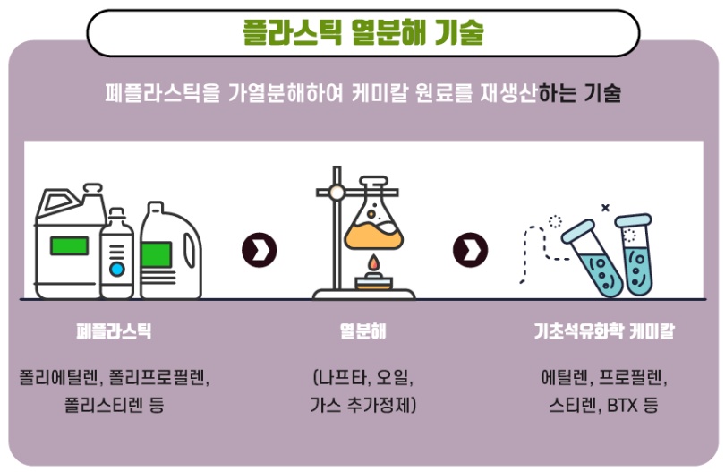 첫 번째로 준비한 용어는 ‘열분해기술’입니다. 열분해기술은 최근 플라스틱 폐기물 증가에 따라 친환경적인 처리 방법으로 자주 언급되는 단어입니다. 환경부에 따르면 현재 우리나라 폐플라스틱 재활용 비율은 54%라고 하는데요. 열분해기술을 통해 플라스틱 폐기물 재활용 비율을 높일 수 있다고 하니, 어떤 기술인지 알아보도록 하겠습니다.
