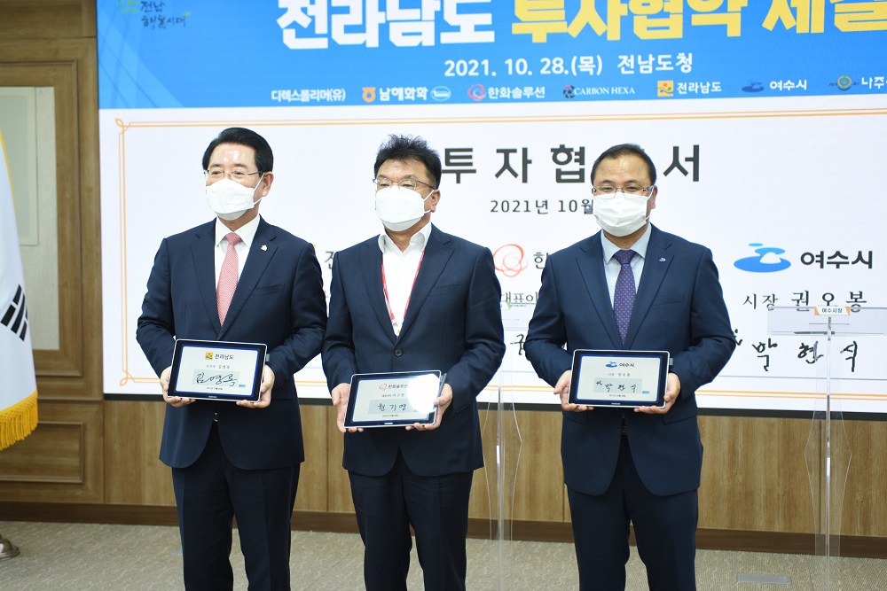 이날 오후 전남도청에서 김영록 전남도지사와 박현식 여수시부시장, 한화솔루션 권기영 부사장, 디렉스폴리머 김만중 대표이사, 남해화학 하형수 대표이사 등 30여 명이 참석한 가운데 협약식이 열렸습니다.