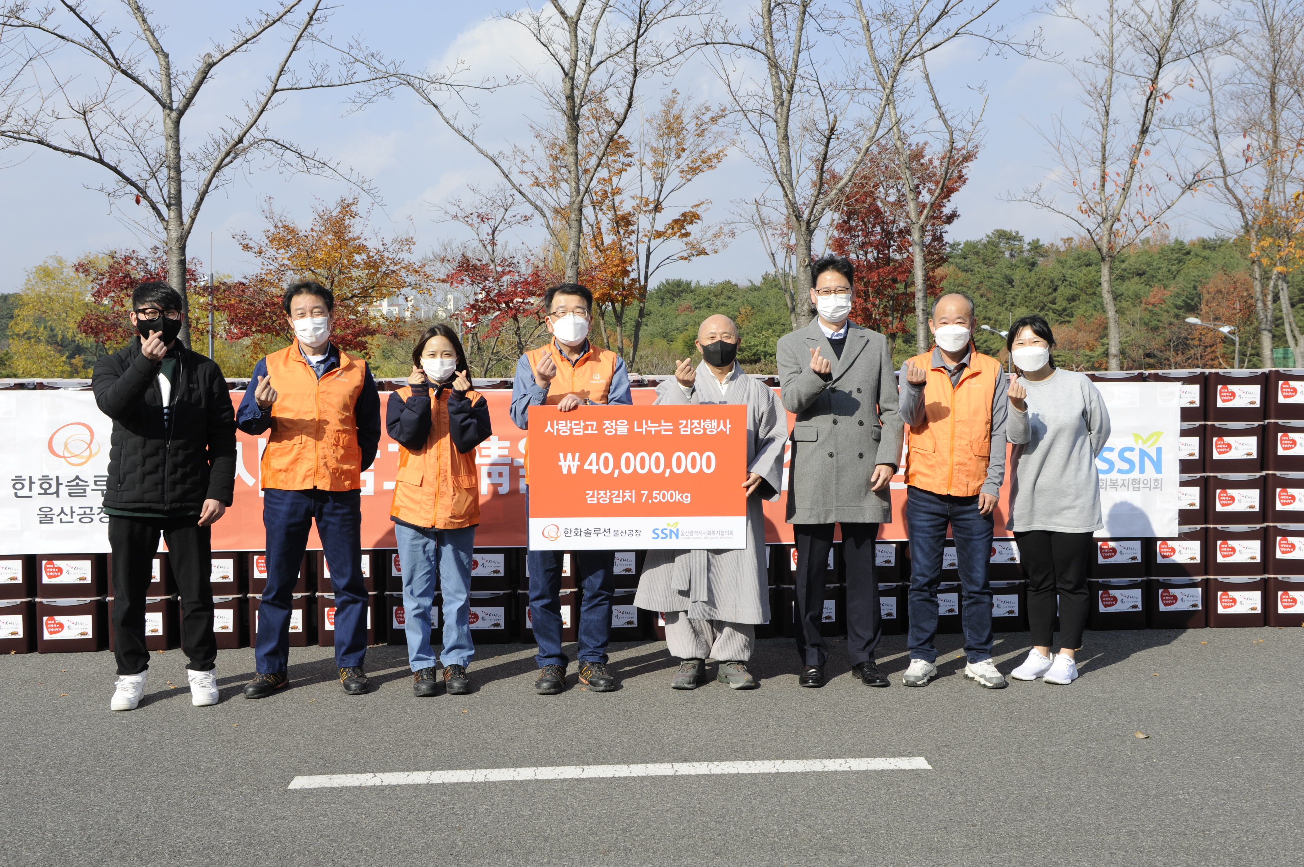 코로나 19로 인해 한화봉사단이 직접 김장에 참여하지는 못했지만, 울산사업장 총무지원팀 직원과 사회복지협의회 관계자들이 모여 김장 750통에 10kg씩 포장했으며, 전년도와 동일하게 비대면 드라이브스루 형태로 배분까지 완료했습니다.