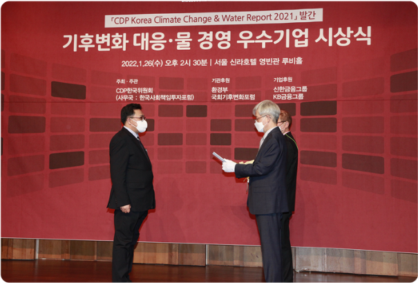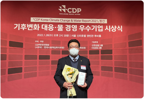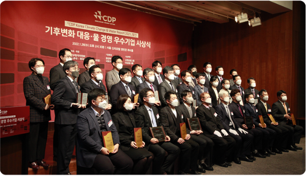CDP는 영국 런던에 본부를 둔 비영리 기관으로 각국 주요 상장기업을 대상으로 글로벌 환경 이슈 대응 활동을 평가해 리더십A, 리더십A-, 매니저먼트B, 매니저먼트B- 등 8개의 등급을 부여합니다. CDP 한국위원회는 2021년 평가를 통해 국내 213개 기업 중 22개 우수기업을 ‘탄소경영 섹터 아너스’로 선정했습니다.
