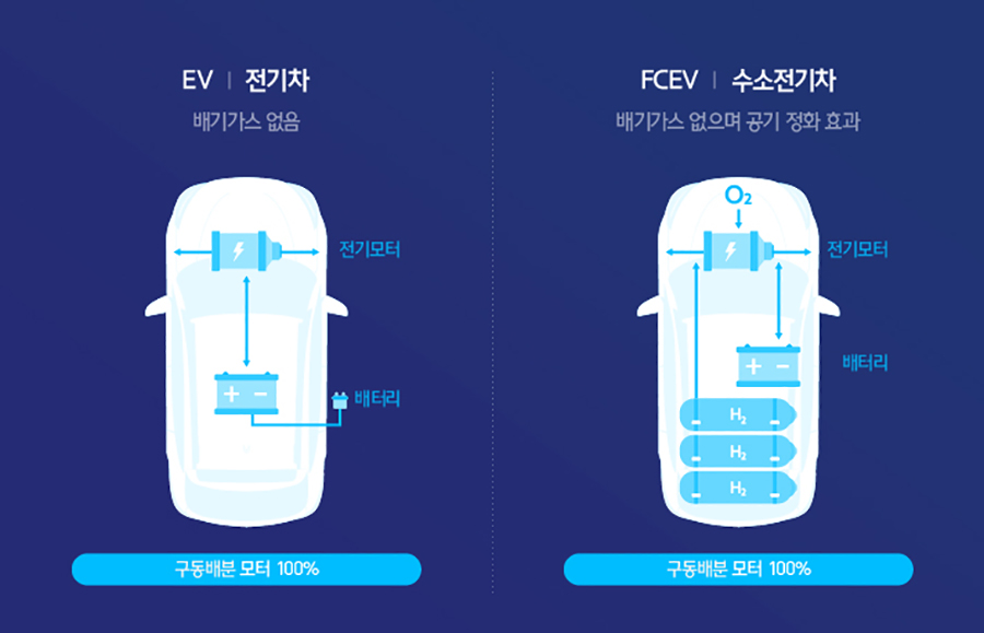 전기차와 수소차 모두 배터리에 저장된 전기에너지를 모터에 전달해 구동시킵니다. 전기차는 외부로부터 전기에너지를 공급받아 충전하는 방식으로, 수소차는 전기차와 달리 스스로 전기를 생산할 수 있습니다.