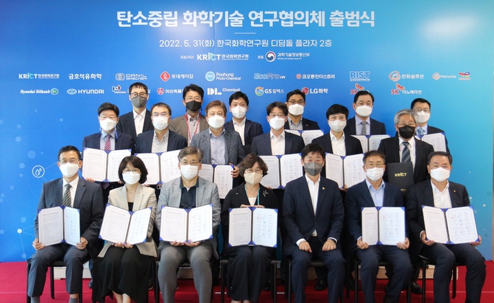 한화솔루션 중앙연구소는 지난 5월 31일 한국화학연구원 및 19개 민간기업과 화학산업 탄소중립 달성 및 차세대 화학산업 대전환의 비전 달성을 위한 '탄소중립 화학기술 연구협의체' 출범을 선언하고, 이를 달성하기 위해 업무협약(MOU)을 체결하는 자리를 가졌습니다.