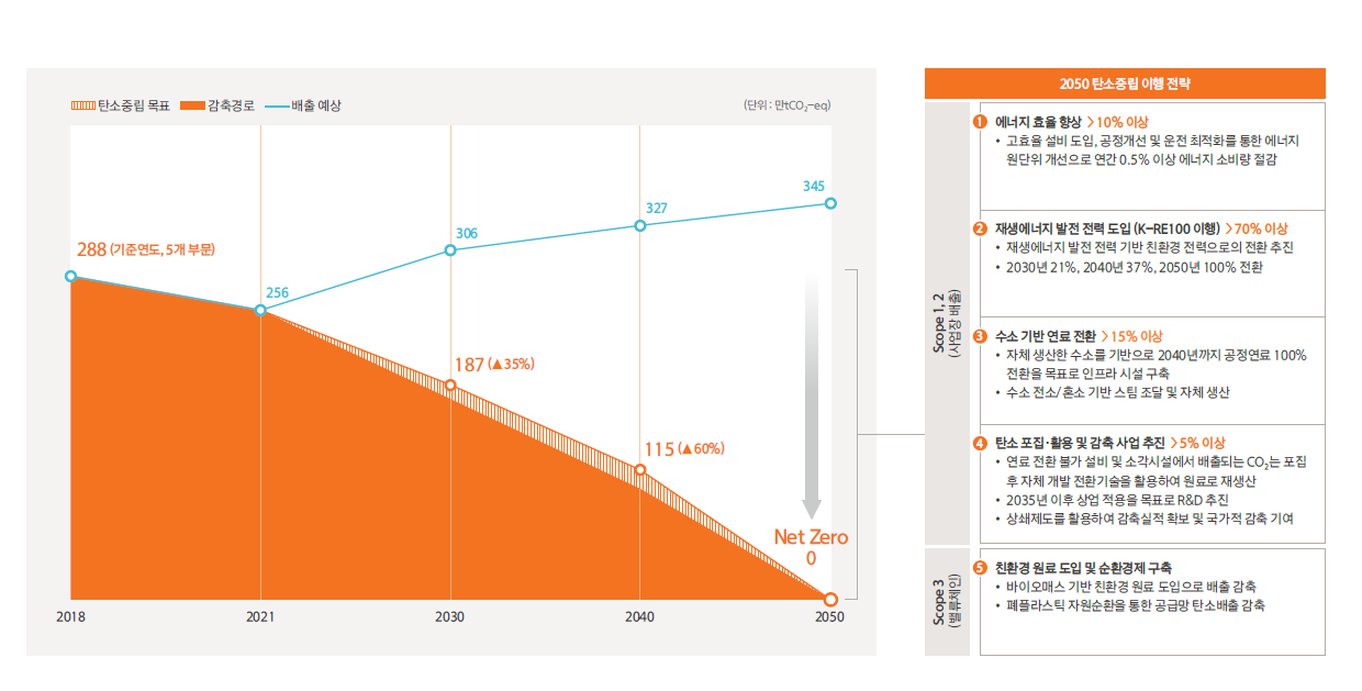 2) 자체 생산한 수소를 사용해 2040년까지 공정상의 연료를 100% 전환하며(15%),