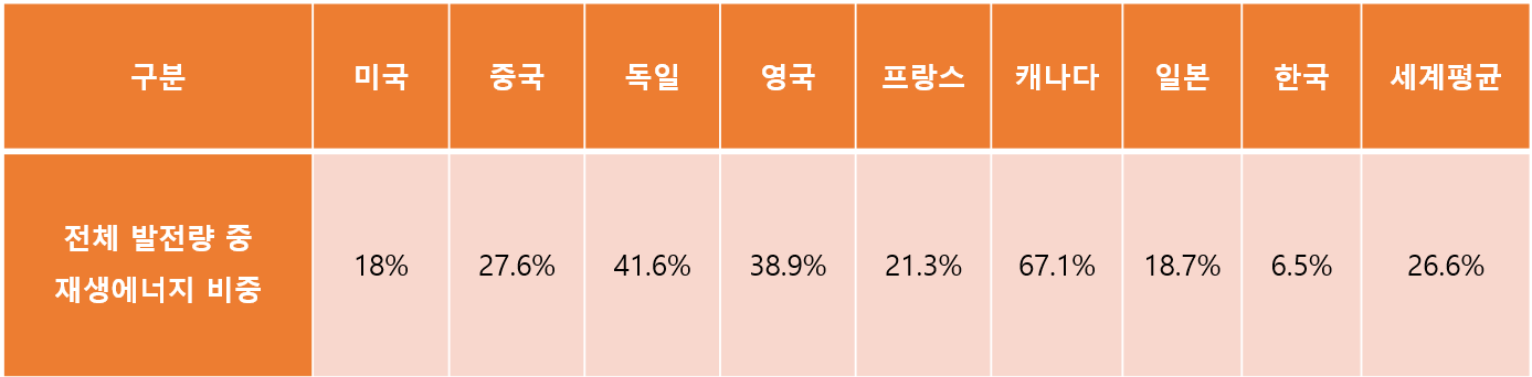 이는 상대적으로 국토가 좁고, 제조업 비중이 높은 우리나라의 특성 상, 비교적 발전 단가가 저렴한 화석에너지에 의존해왔기 때문이라고 볼 수 있습니다. 재생에너지로의 전환이 시급한 상황입니다.