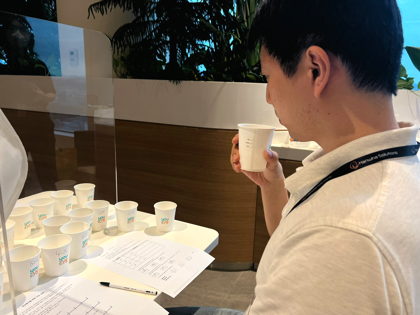관능평가는 사전에 참여를 희망한 직원들을 대상으로 장교동 한화빌딩 28층에서 이루어졌습니다. 가장 먼저 쓴맛과 신맛, 단맛 등을 구분하는 ‘미각 테스트’를 실시한 뒤, 실제 대체육으로 만든 두 가지 종류의 함박스테이크를 맛보고, 이를 비교, 평가하는 시간이 이어졌습니다.