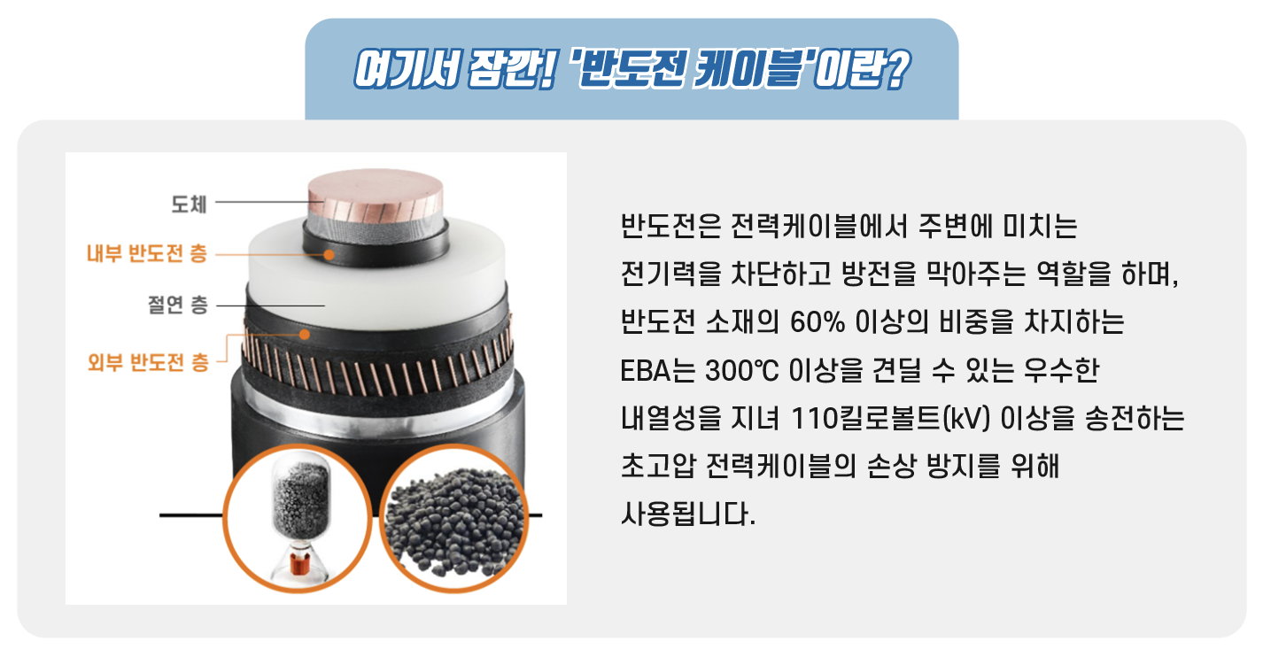 한화솔루션은 지난 2분기부터 연구소가 자체 기술로 개발한 EBA 반도전 소재의 상업생산을 개시하며 수입품 대체에 나섰습니다. 이젠 글로벌 업체에서 생산 하는 제품과 견주어도 손색이 없겠죠~?