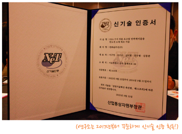 한화솔루션 중앙연구소는 지난 9월 22일, 2022년 제2회 신기술 · 신제품 인증서 수여식에서 'EBA(Ethylene Butylacrylate Copolymer)를 적용한 초고압 전력케이블용 반도전 소재 제조 기술'에 대한 신기술 인증을 받았습니다.