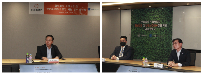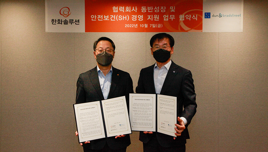 한화솔루션은 지난 10월 7일, 신용평가사 나이스디앤비와 협력사들의 평가부터 컨설팅까지 지원하는 ‘동반성장 및 안전보건 경영 지원 업무협약’을 체결했습니다.