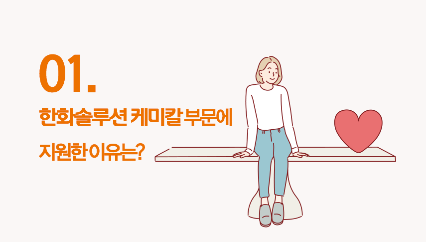 최민준 프로/ PO 생산팀 제가 한화솔루션 케미칼 부문에 지원하게된 계기는 제 전공을 가지고 일할 수 있는 기업들 중에서 업계에 자리를 잘 잡고 있고 앞으로의 비전도 있으며 업무를 배우면서 성장할 수 있는 곳이라 생각했기 때문에 지원하게 되었습니다.