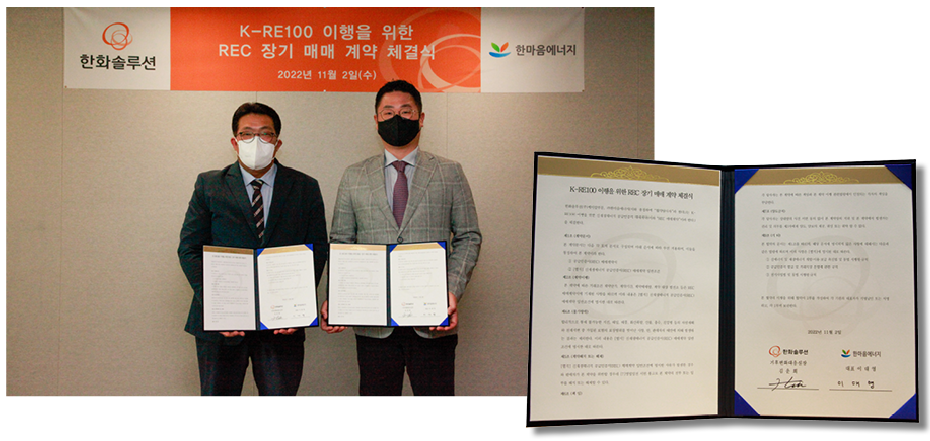 한화솔루션은 한국형 재생에너지 100% 프로그램 ‘K-RE100’을 이행하기 위한 재생에너지 공급 인증서(REC) 확보를 위해 한마음에너지와 REC 장기 구매 계약을 체결했습니다.