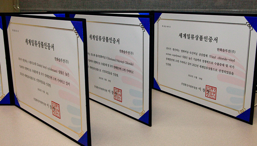 지난 18일, 서울 중구 롯데서울호텔에서 열린 ‘2022년 세계일류상품 선정기업 인증서 수여식’에서 한화솔루션의 친환경가소제 에코 데치(Eco-DEHCH), 염소화 폴리염화비닐(CPVC), 코폴리머/터폴리머(CP/TP) 등 3개 품목이 세계일류상품으로 선정되었습니다.