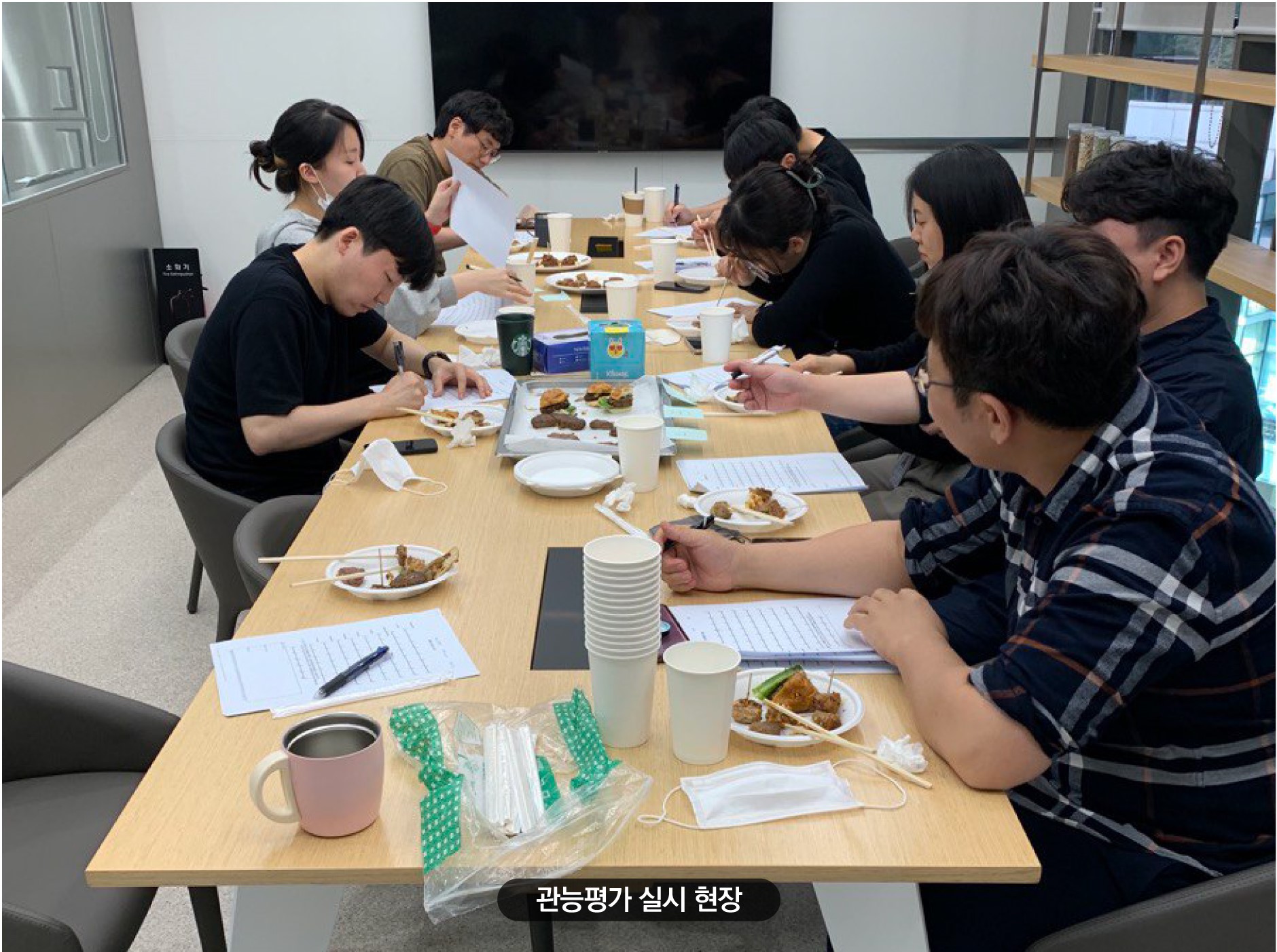 바이오이엔지 구성원들은 정기적으로 대체육 제품을 시식/평가하고 인사이트를 공유합니다. 이제는 제품의 맛만 봐도 어떤 브랜드인지 알 수 있을 정도로 관능평가의 달인이 되었습니다.