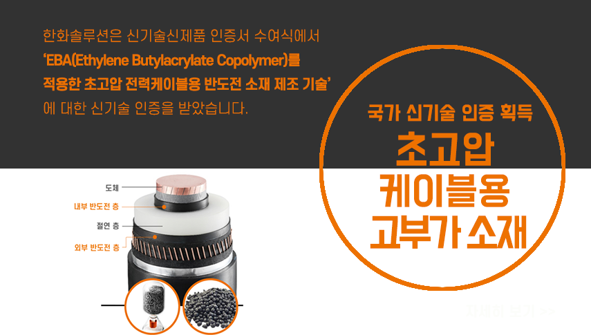 9월에는 한화솔루션의 ‘EBA(Ethylene Butylacrylate Copolymer)를 적용한 초고압 전력케이블용 반도전 소재 제조 기술’이 신기술 인증을 받았습니다.