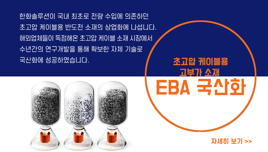 다음은 전량 수입에 의존해오던 초고압 케이블용 반도전 소재인 EBA를 한화솔루션이 국내 최.초.로 국산화에 성공했다는 소식입니다.