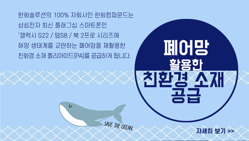 3월에는 한화솔루션의 100% 자회사 한화컴파운드가 폐어망을 활용한 친환경 소재 공급에 나섰다는 소식을 전해드렸습니다. 한화컴파운드는 삼성전자와 협업해 최신 플래그쉽 스마트폰인 '갤럭시S22 / 탭S 8 / 북 2 시리즈에 폐어망을 분쇄하여 가공한 친환경 폴리아미드(PA) 소재 부품을 공급하고 있습니다.