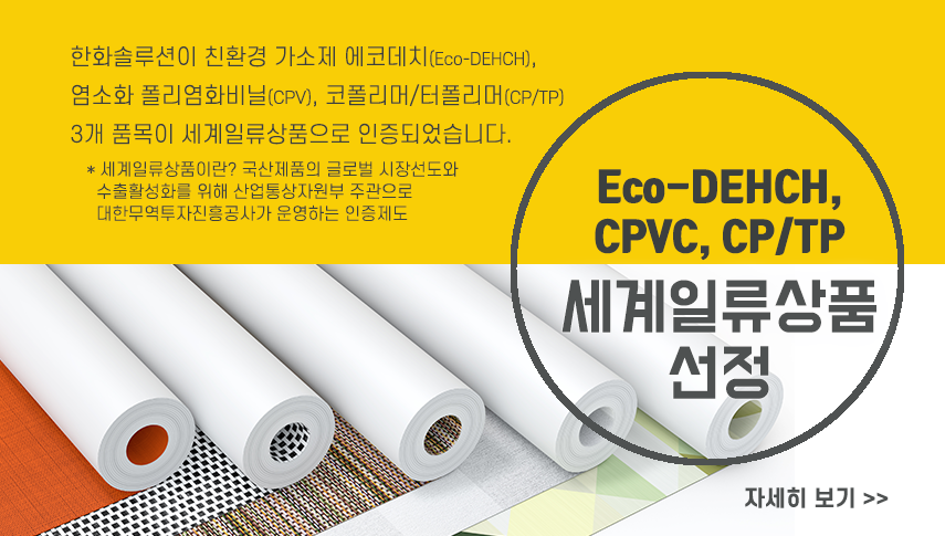 11월에는 한화솔루션이 개발한 프탈레이트 프리(Phthalate-free) 가소제 '에코데치(Eco-DEHCH)', '염소화 폴리염화비닐(CPV)', '코폴리머/터폴리머(CP/TP)' 등 3개 품목이 세계일류상품으로 선정되었습니다.