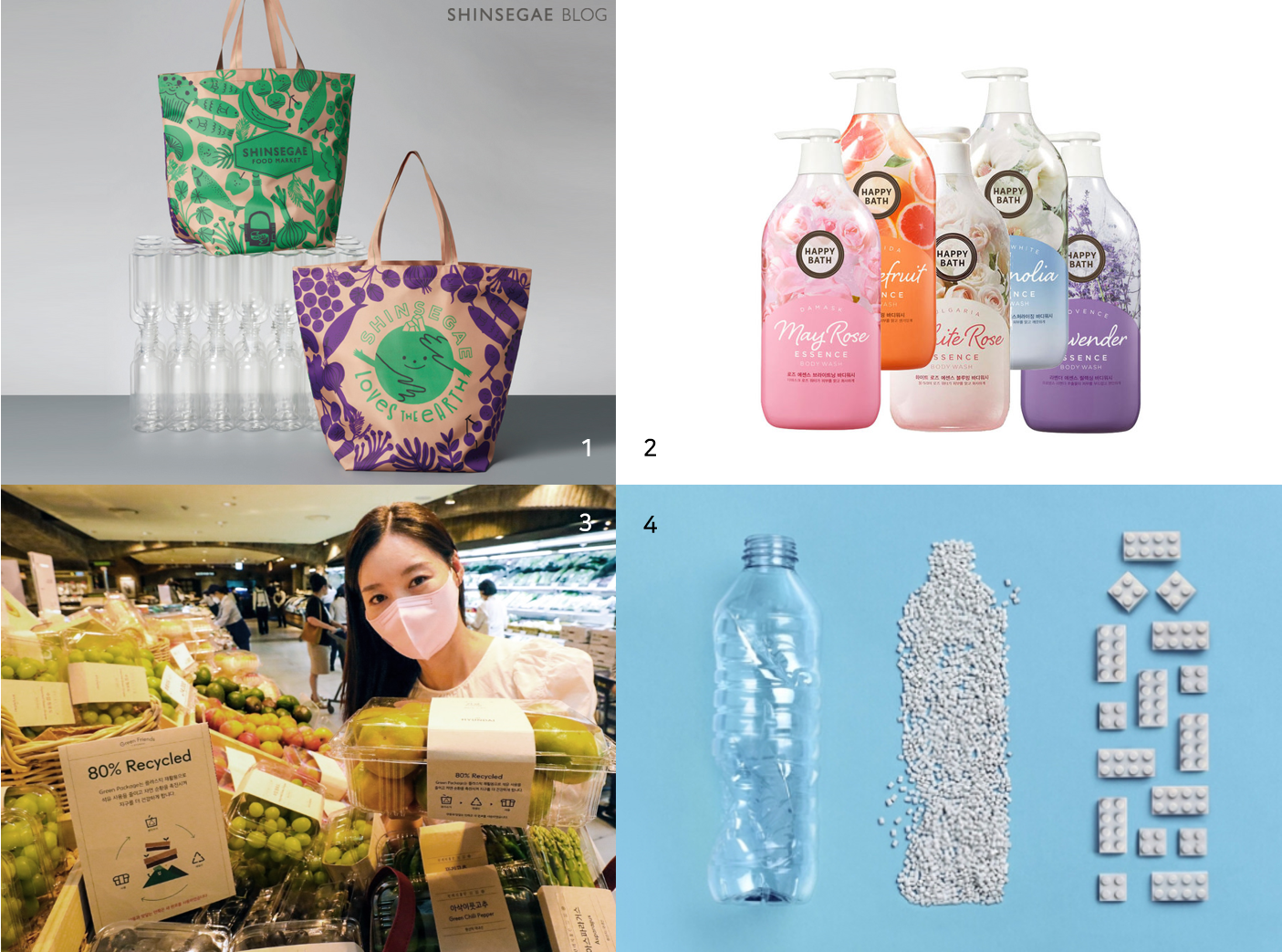 신세계백화점은 폐페트병을 재활용해 만든 친환경 장바구니를 도입했으며, 현대백화점에서는 재활용 페트 포장용 시트를 활용한 식품용기를 사용해 과일과 야채를 포장하고 있습니다.