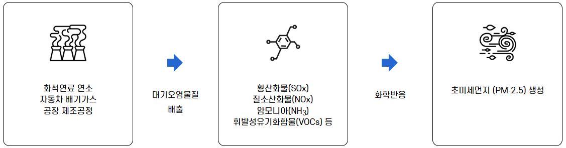 특히 초미세먼지 중 2/3 이상이 황산화물, 질소산화물, 암모니아, 휘발성유기화합물 등이 대기 중의 특정 조건에서 반응해 생긴 2차 미세먼지로, 이를 억제하는 방안에 대한 연구도 진행되고 있습니다.