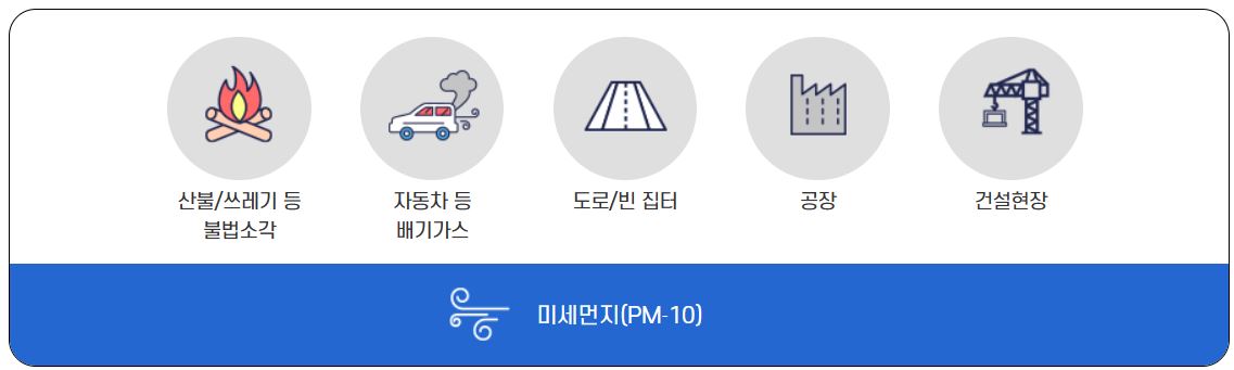 미세먼지는 황산염, 질산염 등 이온성분과 금속 및 탄소로 이루어진 화합물로 구성됩니다. 머리카락 굵기의 30분의 1 정도 크기인 초미세먼지는 호흡할 때 기도에서 걸러지지 않고 폐까지 침투하기 때문에 호흡기 질환의 원인이 됩니다.
