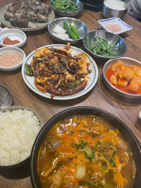 푸짐한 순대국과 불맛가득한 오징어 직화구이의 조화,