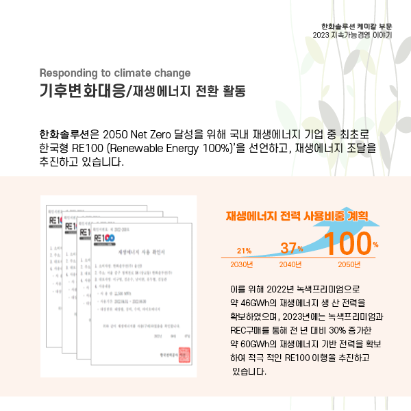 한화솔루션이 ESG(환경·사회적책임·지배구조) 활동 성과를 담은 ‘2023년 지속가능경영보고서’를 발간했습니다. 이번 보고서에서는 한화솔루션의 다양한 재생에너지 전환 확대 노력과 성과가 강조되었습니다.