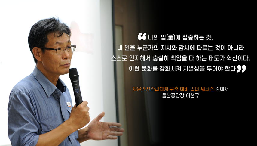 이번 워크숍은 부서별 최소 단위 조직의 차.선임자 55명을 대상으로 장상무 안전보건환경실장 및 이현규 울산공장장이 직접 강의하며 현장중심 자율안전문화 구축을 위한 목적으로 진행되었습니다.