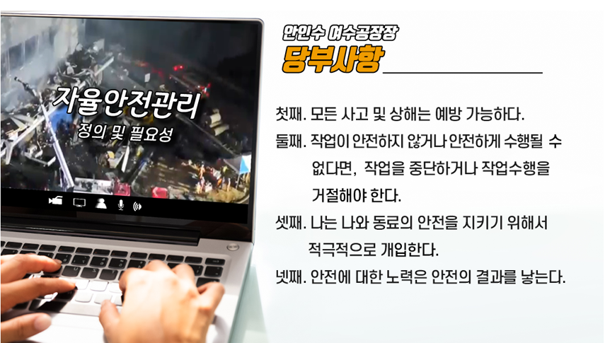 앞으로도, 한화솔루션 여수사업장은 자율안전관리 체계가 정착될 수 있도록 모든 임직원이 최선을 다하여 노력하겠습니다.