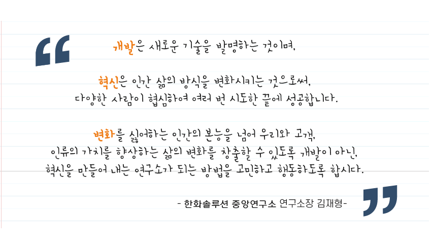 한화솔루션 중앙연구소는 혁신 및 본질 업무에 대해 정의하고, 자유롭게 논의한 후 업무에 적용할 방안을 수립하기 위한 혁신워크샵을 8월~9월 두 달 동안 실시하였습니다.