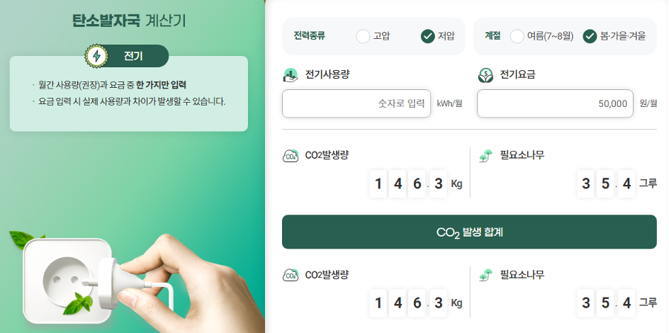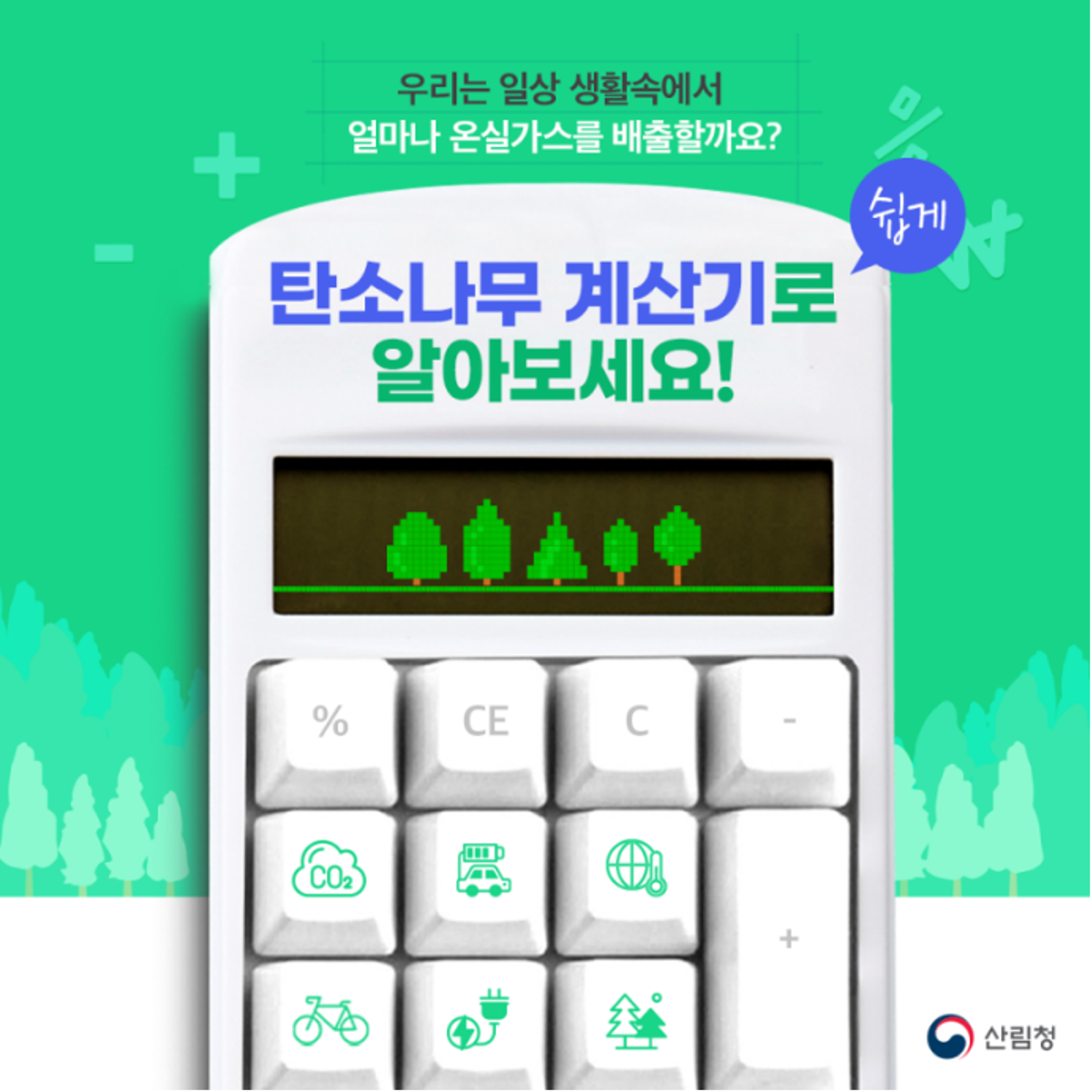 산림청에서도 우리가 배출한 이산화탄소 양을 계산하고 이를 흡수하기 위해 심어야 하는 나무 그루 수를 알려주는 탄소나무계산기를 운영 중입니다.