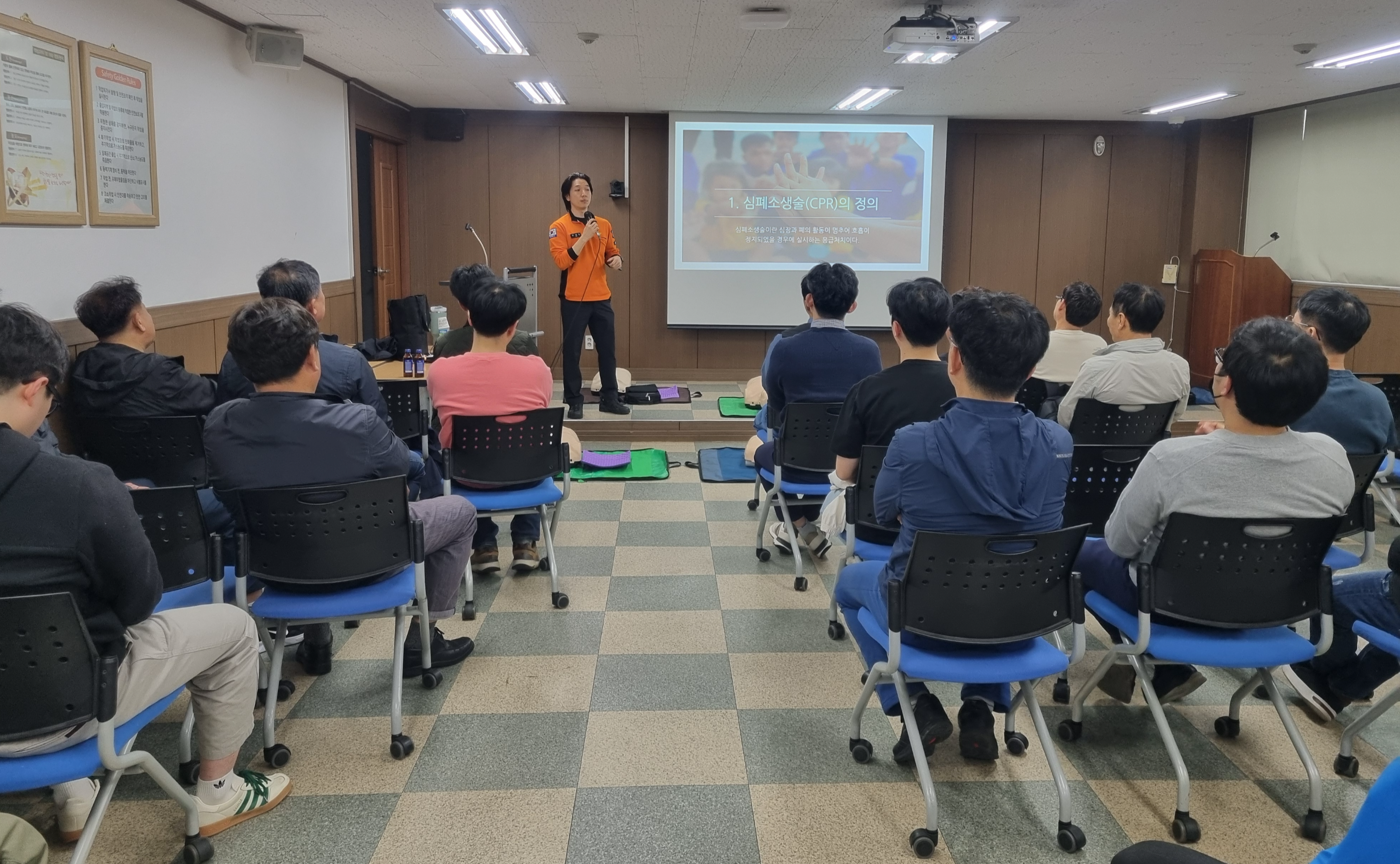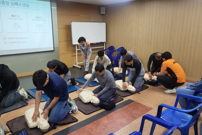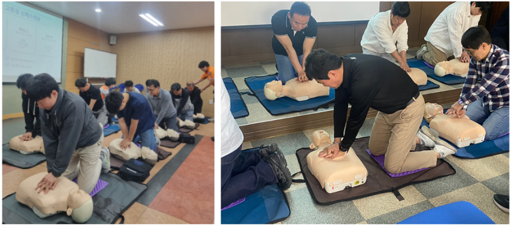 이번 교육은 사업장 내 위급 상황 발생 시 골든타임 안에 신속하게 대처하는 위기 대처 능력을 강화하고자 실시됐습니다. 주요 내용은 응급 상황 발생 시 대처 요령, 심폐소생술 이론 교육과 개인별 실습, 자동심장충격기 작동 원리와 사용법 등 입니다.
