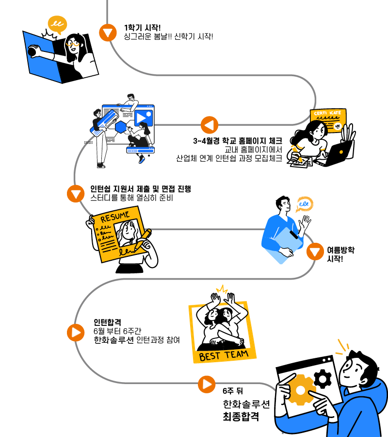 저는 대학교 4학년 1학기 재학 중, 산학협력 채용 전제형 인턴쉽 과정을 알게 되었고 인턴쉽 종료 후 운이 좋게 합격하여 입사한 케이스로