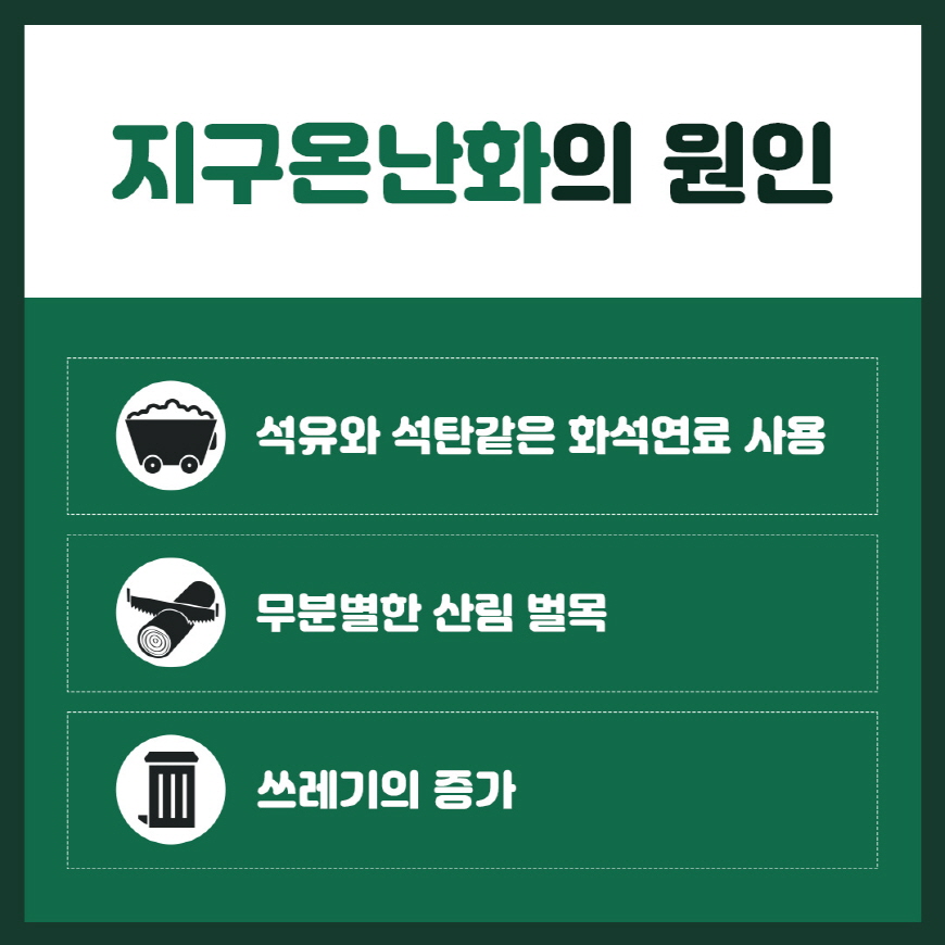 화석연료사용, 무분별한 산림벌목, 쓰레기의 증가등이 있어요.