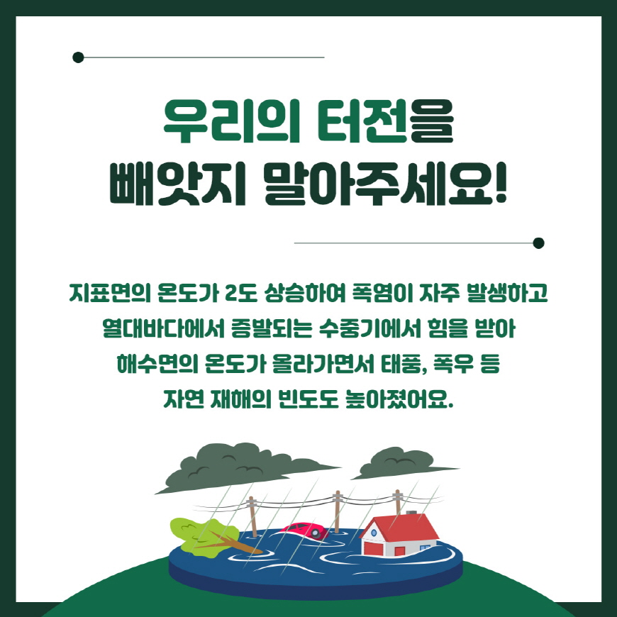 지표면의 온도 상승으로 우리의 터전도 위협받고 있어요.