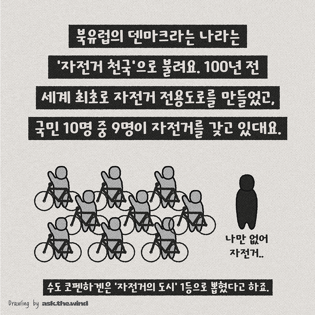 덴마크는 세계최초로 자전거 전용도로를 만들었어요.