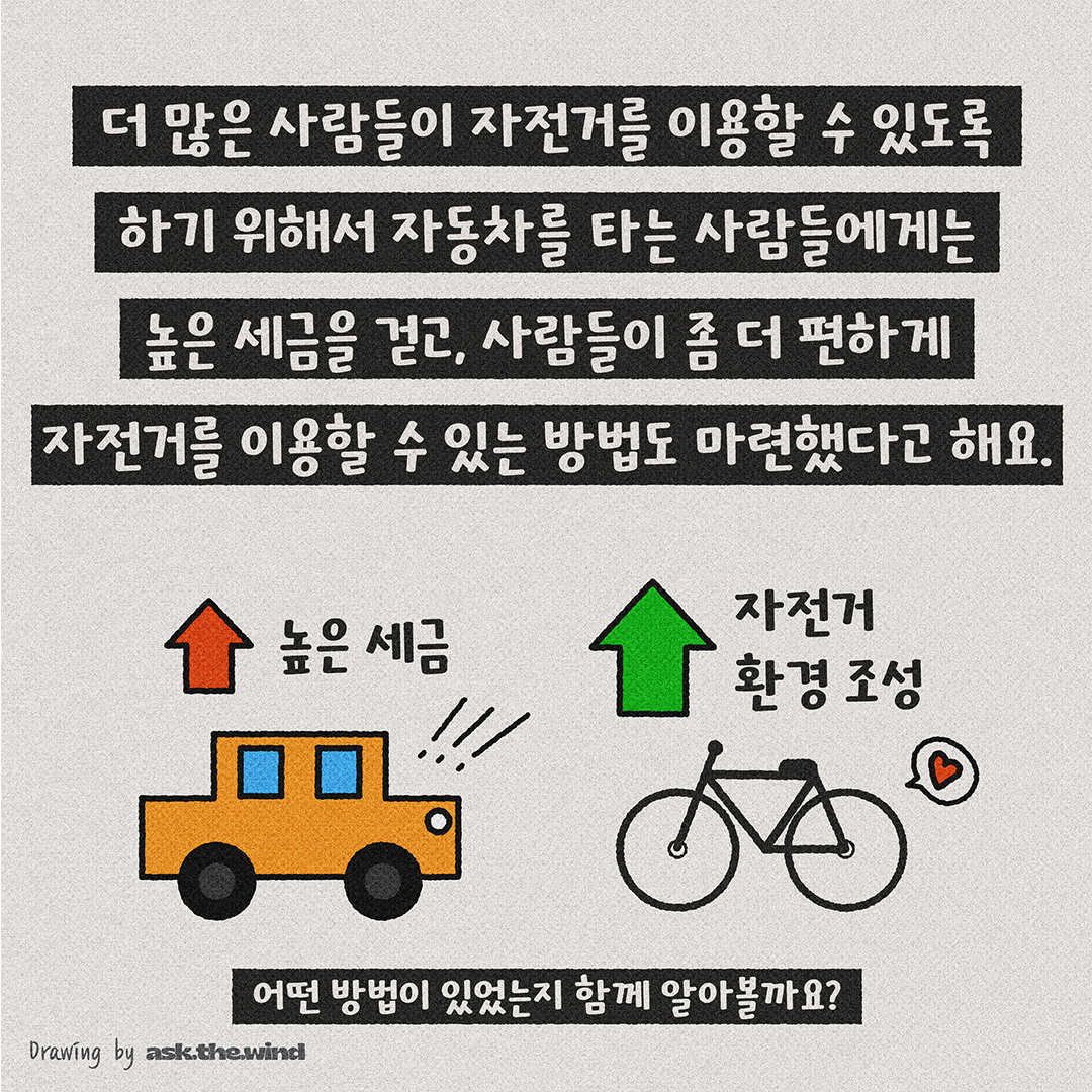 자전거를 탈수 있는 환경조성을 위해 자동차를 타는 사람들에게 높은 세금을 걷고 있다고 해요.