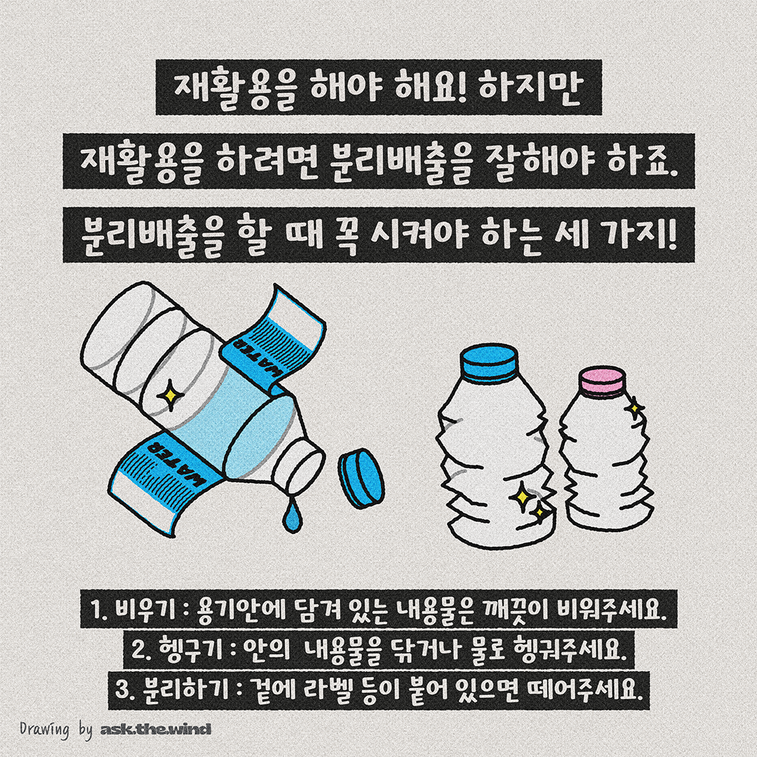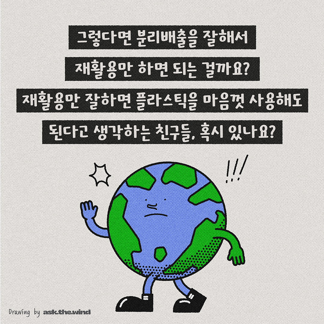 지구를 위해 플라스틱용기 사용은 줄이고, 재활용 분리배출을 바르게 하기로 해요.