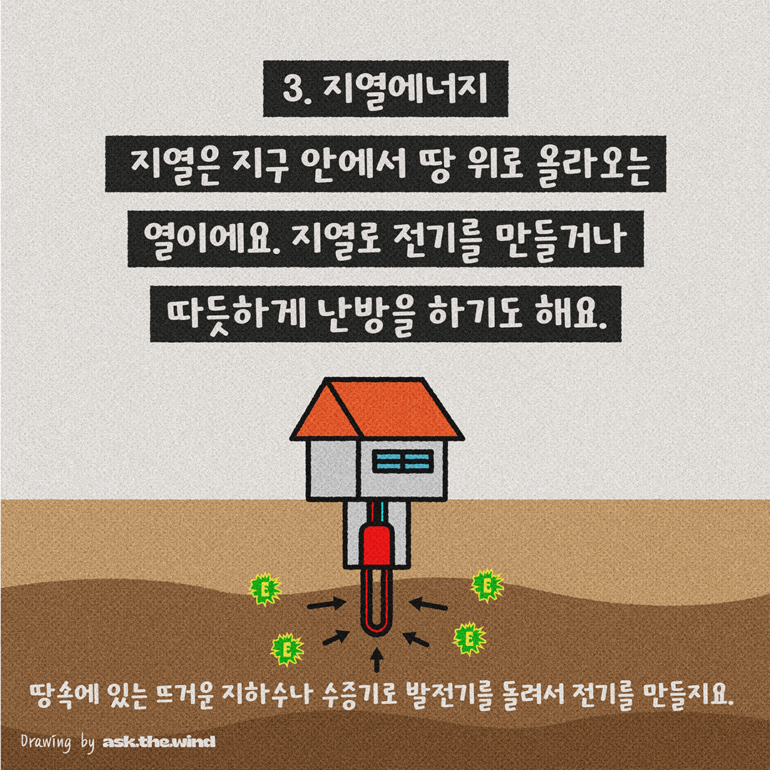 땅에서 올라오는 열기로 지열 에너지를 만들어요.