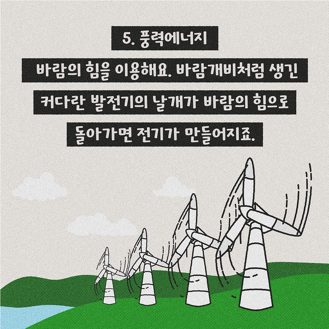 바람의 힘을 이용해 풍력에너지를 만들어요.