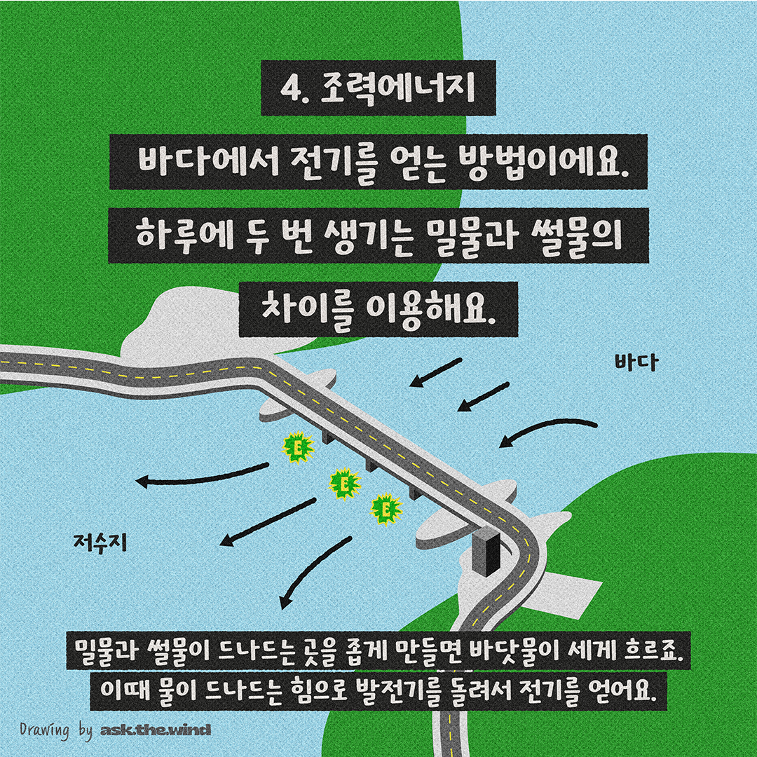 조수간만의 차를 이용해 조력에너지를 만들어요.