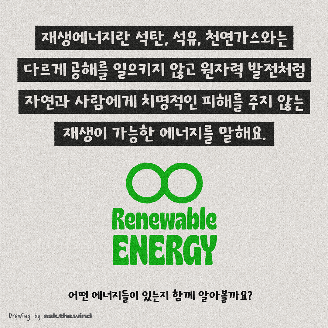 재생에너지란 공해를 일으키지않고 재생이 가능한 에너지를 말해요.