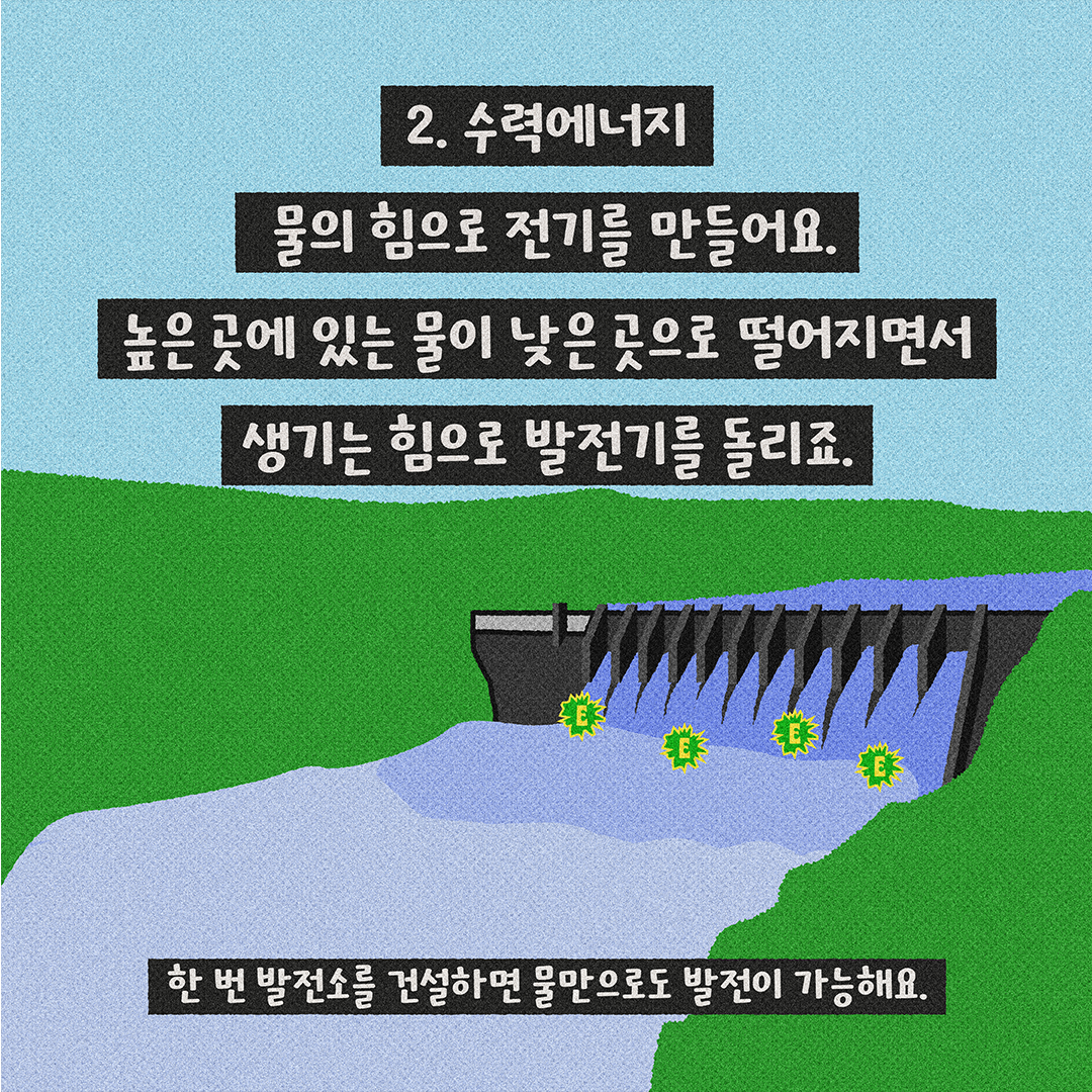 높은곳에 있는 물을 아래로 떨어뜨려 생기는 힘으로 수력에너지를 만들어요.