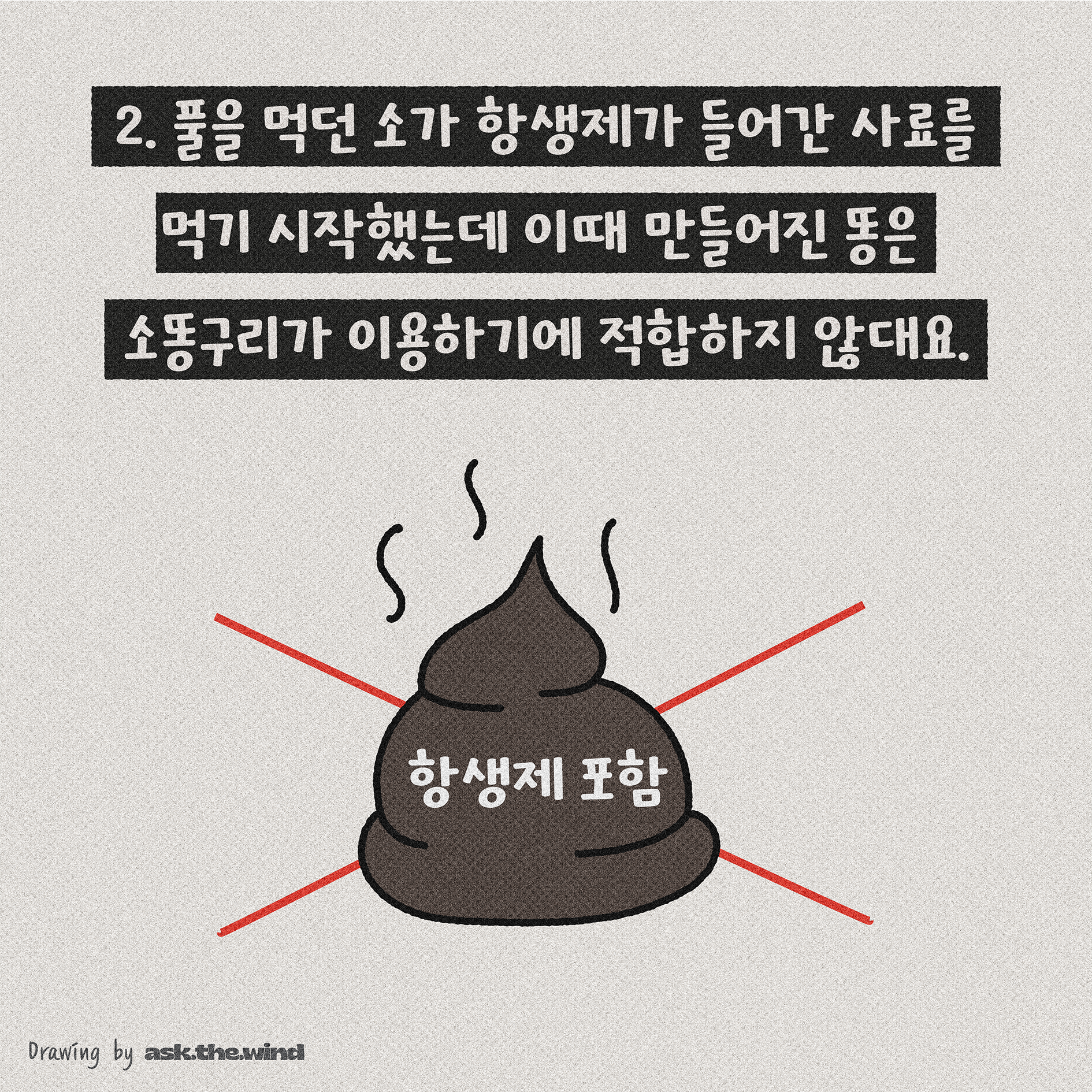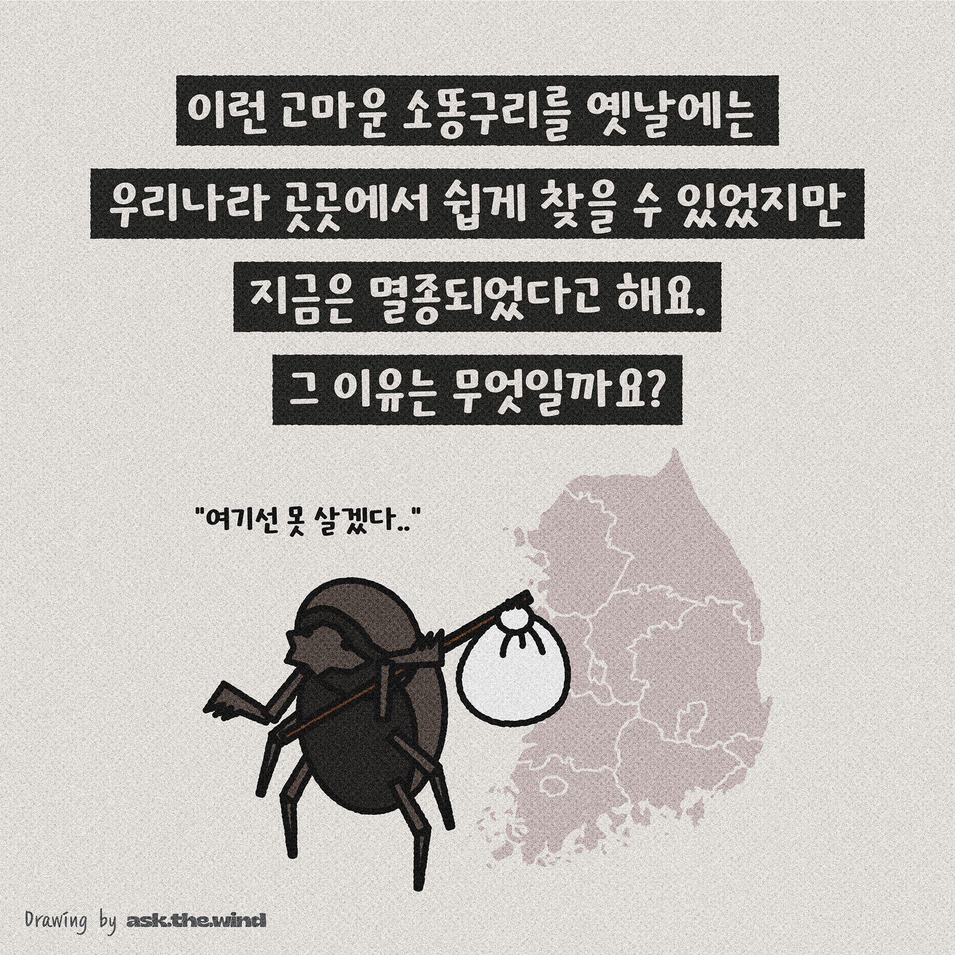 소똥구리가 먹이를 찾기 힘들게 만들었고, 항생제가 들어간 사료로 소똥구리가 먹기에 적합하지 않았어요.