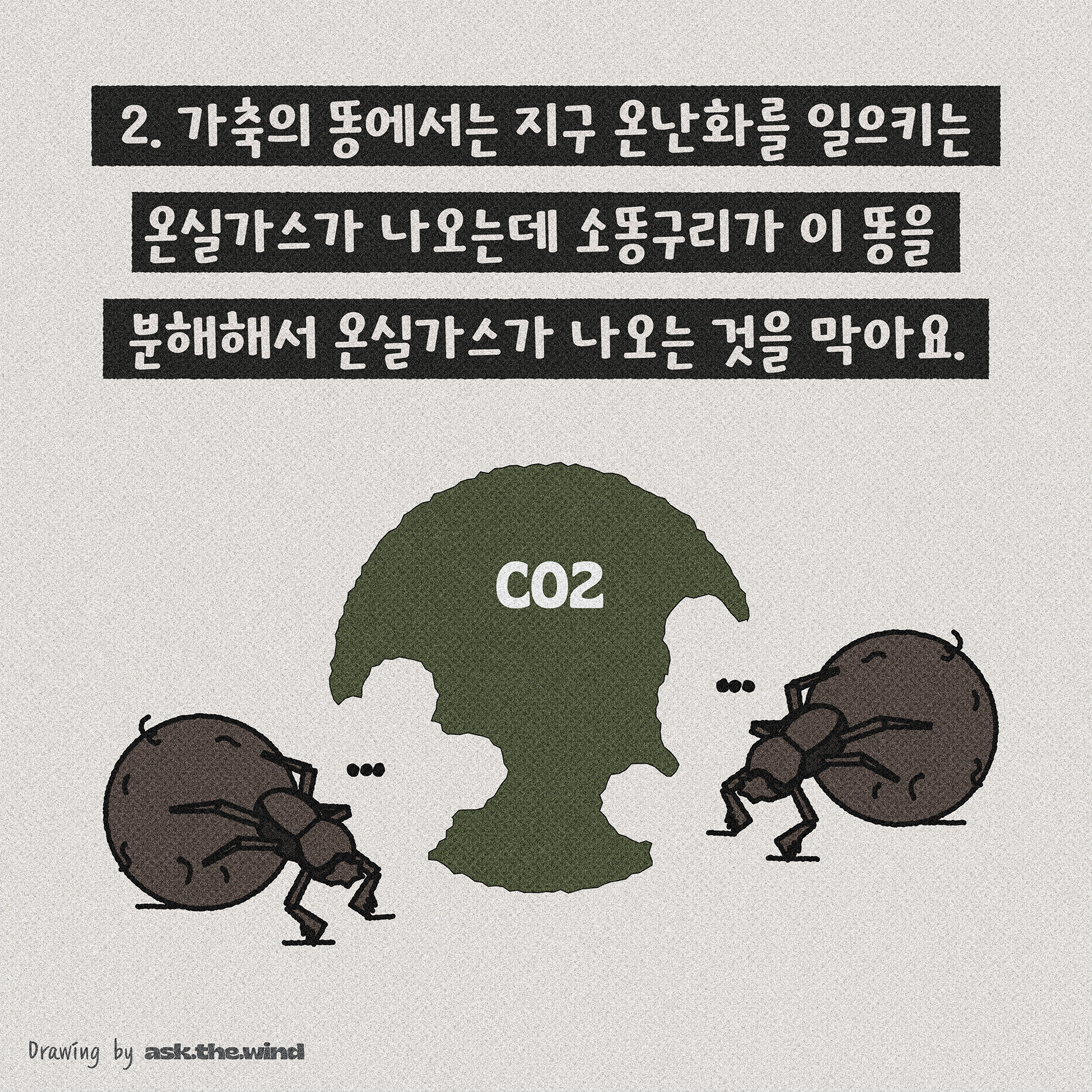 가축의 똥에서는 지구 온난화를 일으키는 온실가스가 나오는데 소똥구리가 그걸 막아요.