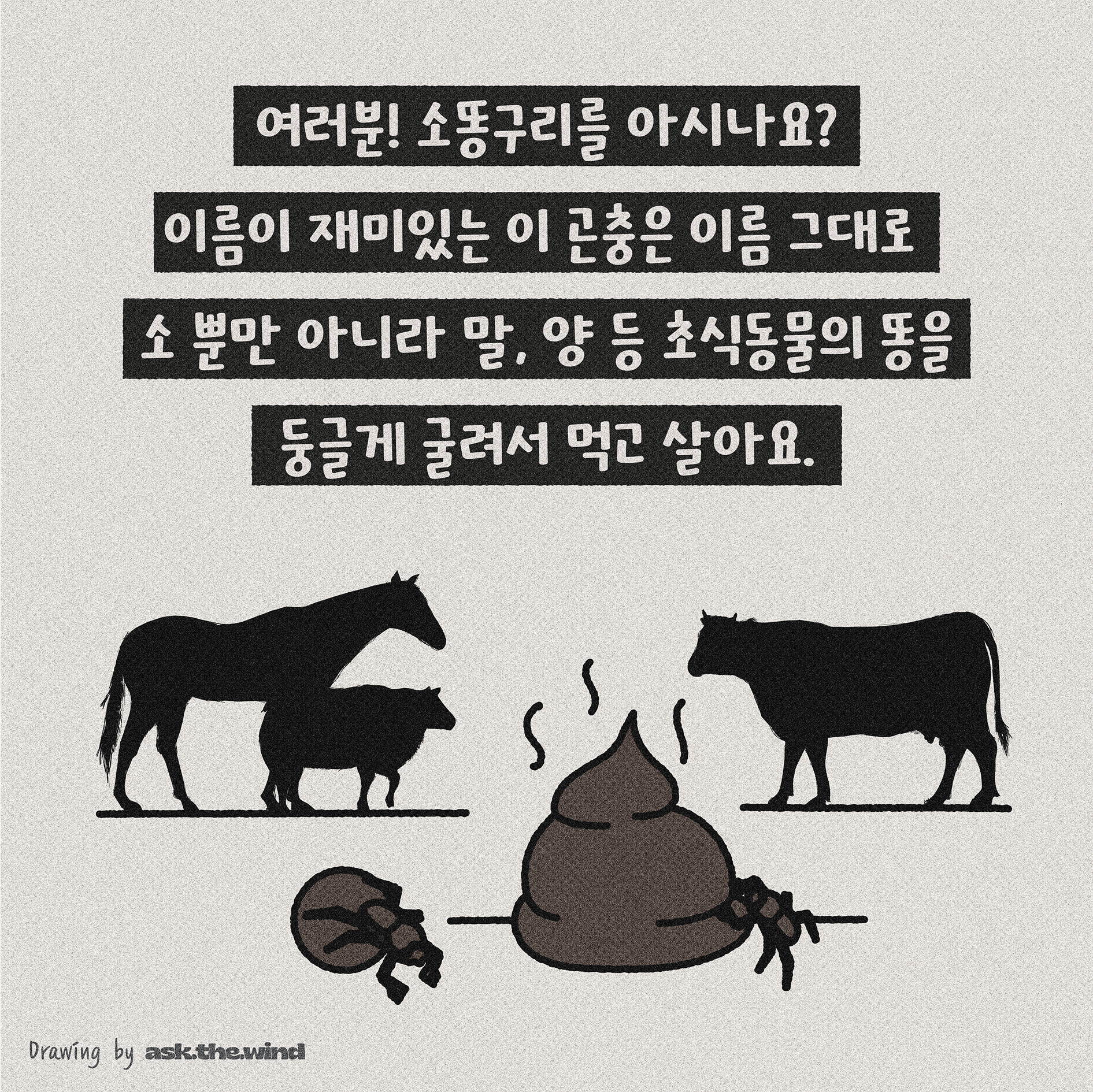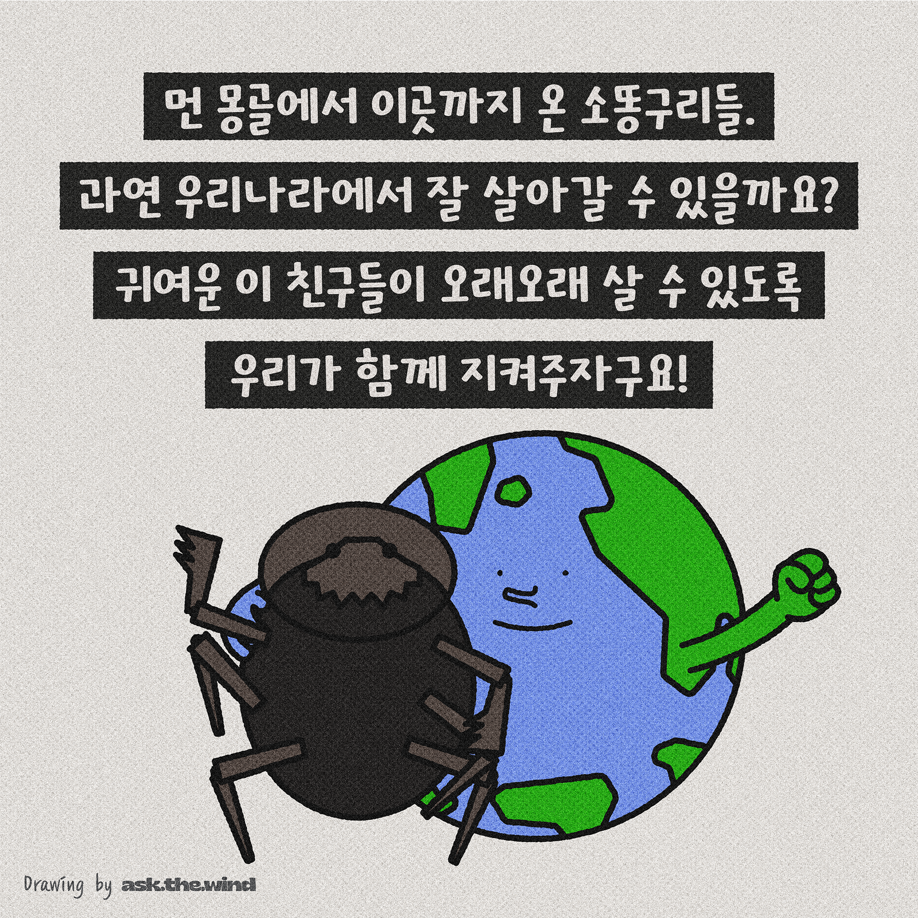 먼 몽골에서 우리나라까지 온 소똥구리들, 이 귀여운 친구들이 오래 살 수 있도록 함게 지켜주기로 해요.