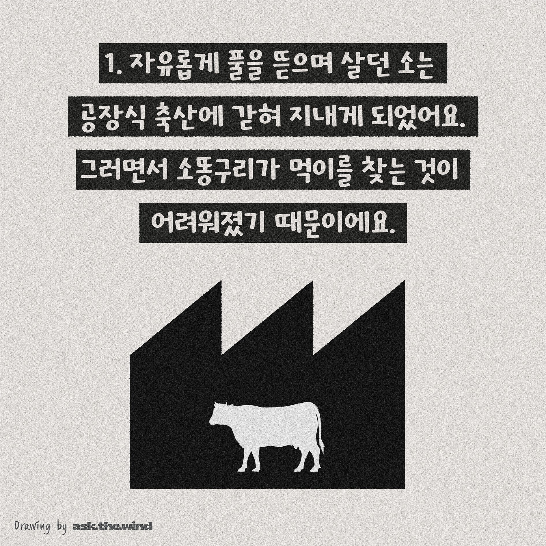 그이유는 자유롭게 풀을 뜯으며 살던 소는 공장식 축산에 갇혀지네게 되었어요.