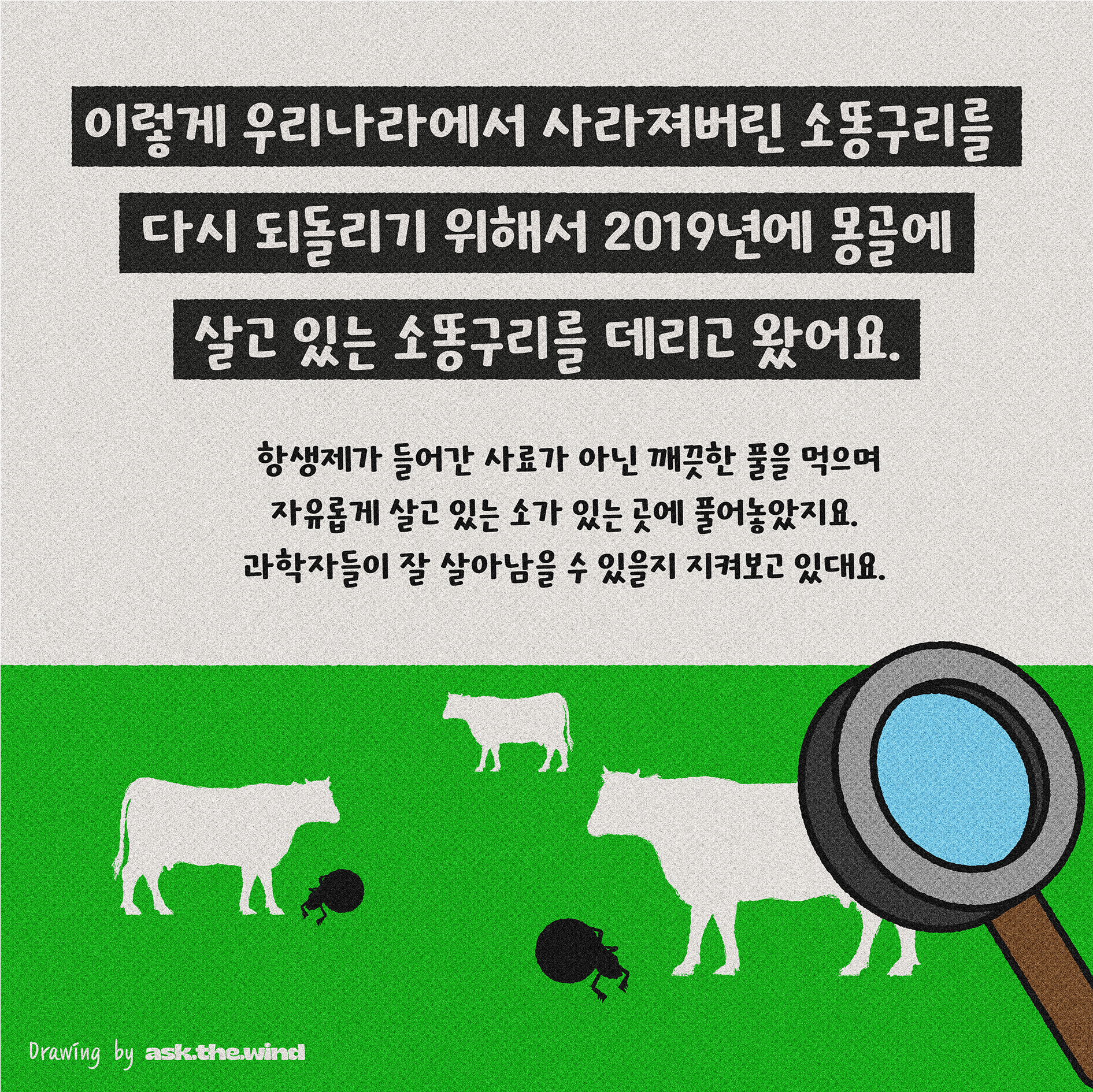 우리나라에서는 사라져버린 소똥구리를 다시 살리기 위해 2019년에 몽골에서 살고 있는 소똥구리를 데려왔어요.